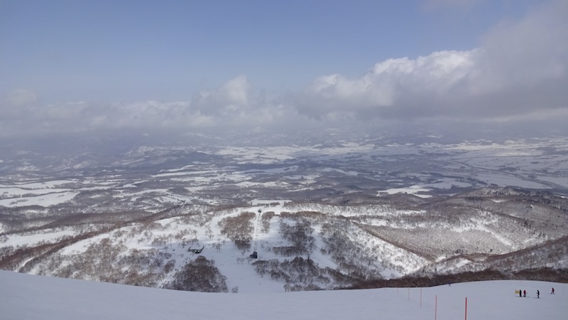 冒頭の画像は「羊蹄サンセット」というオシャレな名前のコースからの景色です。雪が柔らかいうちは気持ちよかったですが、ガリガリ君になるとエッヂがすっぽ抜けそうな恐ろしい斜面でした。真っ白で起伏が見えない上に前日の雨でアイスバーンになってしまった山頂付近の斜面も強風が吹くとけっこう足がすくみます。