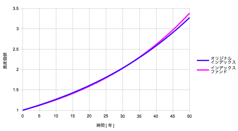 この場合の配当課税複利ロスと信託報酬とのバーターがどうなるかをエクスポネンシャルカーブで確認しておきたいと思います。