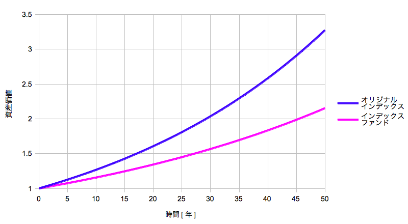 例えば、簡単のためにインカムだけで考えると、配当3%で配当課税20%の課税後再投資だと3×(1-0.2)=2.4%の複利になります(非課税口座は除く)。ただし売却時の譲渡課税と信託報酬は無し。一方(日本株)インデックスファンドでは配当課税を先送りできるので3%まるまる複利に寄与する。ただし売却で譲渡課税が20%かかり、信託報酬をエイヤで0.2%とする。