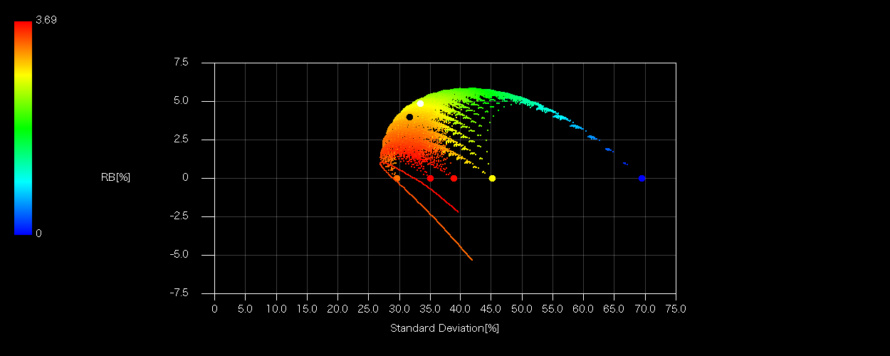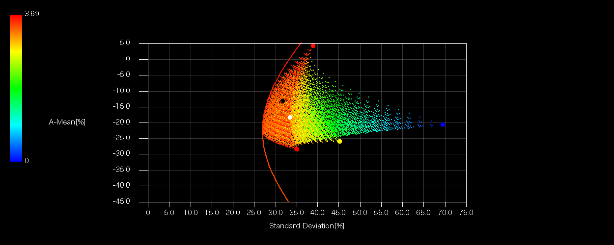 各プロットのX軸はシグマ(標準偏差)、Z軸(色)は加重平均配当利回り、ラインは全要素の有効フロンティア、ドットは5%ピッチSOBOLシーケンスによる総当たりマトリクスであり、組み合わせの数は5H20=24C20=10626通り。ドットに埋もれてしまうので均等配分(白丸)、加重配分(黒丸)は配当によらず色を変えています。