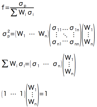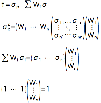 手順としてはウェイトの制約条件下で上記関数fの極値を求めることになると思います。いつも通りラグランジュ未定乗数を適用しようとすると、合成関数の微分なので複雑になること、分散ではなく標準偏差の次元なので√が出てくること、などで難儀しています(いわゆる非線形ではないかと)。