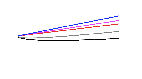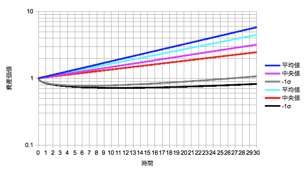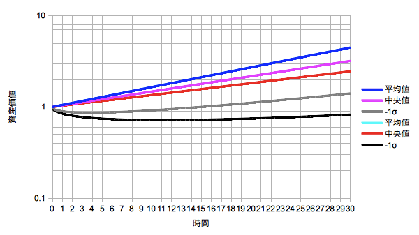 標準偏差をσ=20→15%、相加平均をr=5%として波動砲の「半身(はんみ)」をプロットしたものです。青色、桃色、灰色がσ=15%、水色、赤色、黒色がσ=20%の組になります。