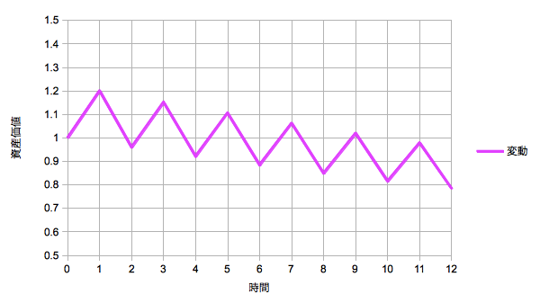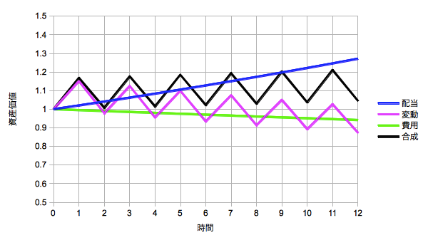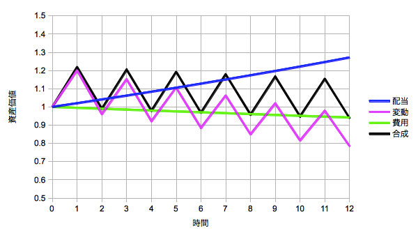 つまり、配当によって指数関数的に資産が上昇しても、市場変動によって相殺され、さらにコストが追い討ちをかけてしまうことを表現しています(ギザギザの下限と費用成分が重なっているのは配当と変動を略同等にしているからで、パラメータ次第で必ずしも一致するものではありません)。