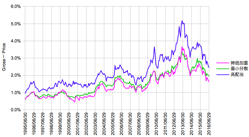 低シグマ投資」における「MSCI JAPAN」の「③ローリング・リターン」を「Price(配当なし)」でも算出して「Gross(課税前配当あり)」から減算したものです(終端処理の都合等で期間は変えてあります)。