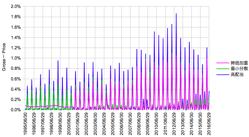 高配当は「High Dividend Yield」の名に恥じない高配当っぷりです。場合によっては時価加重や最小分散に対して年率1%超のオーバーとなるようです。また近年は全体的に配当が右上がりであることがわかります。