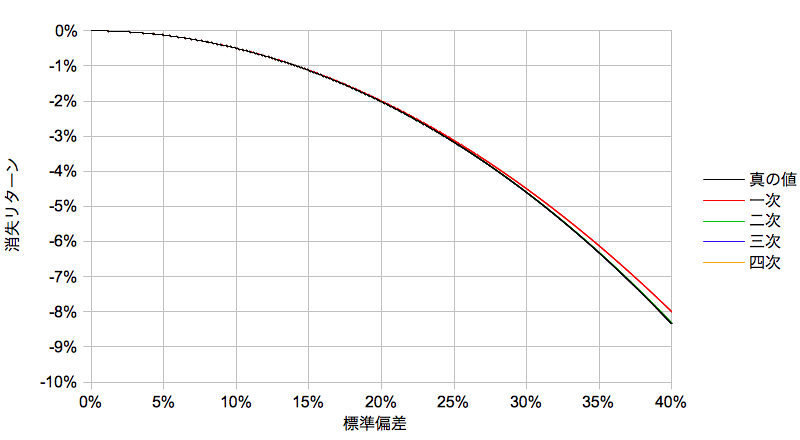 この近似式をもとに、横軸に標準偏差シグマを取り、冪級数展開の次数別にラインを分けたものが冒頭のプロットになります。σ=30%程度まではほとんど差がわかりませんが、シグマが大きくなるにつれて真の値と近似結果との乖離が大きくなることがわかります。通常のインデックス投資ではほとんどこの領域まで至らないとしても、個別株やレバレッジタイプによってはその限りではないと考えられます。