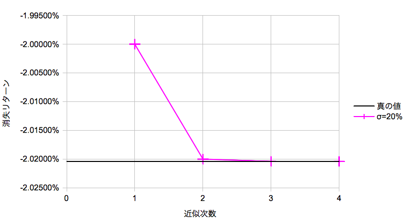 さらにσ=20%に固定して横軸に次数を取ることで近似精度を確認します。