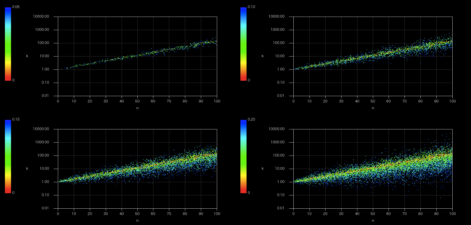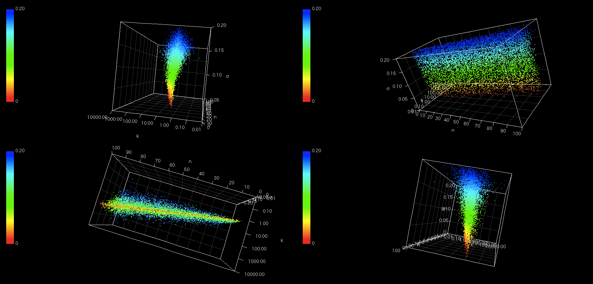 シグマ(σ)を固定値から一様乱数に移行してシグマ方向の連続分布を表現します。相加平均(r)を5%で固定、時間(n)と資産価値(k)を一様乱数で振ってその時の信頼区間(a)を算出(資産価値は乱数のエクスポネンシャル)。確率を対称にするためにaを絶対値として累積確率関数に放り込み、一様乱数との大小比較により条件を満たせばその時の(n,k,σ)をグラフに「ドット打ち」します。