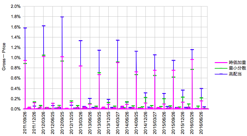 インデックス投資における配当成分の定量化」における微分形の成分分離(Gross-Price)を日単位で実施した結果です。対象は「MSCI JAPAN」の時価加重、最小分散、高配当で期間は2011/08/26から2016/08/26の5年間。