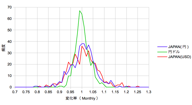 【変化率のヒストグラム(KOKUSAI INDEX)】