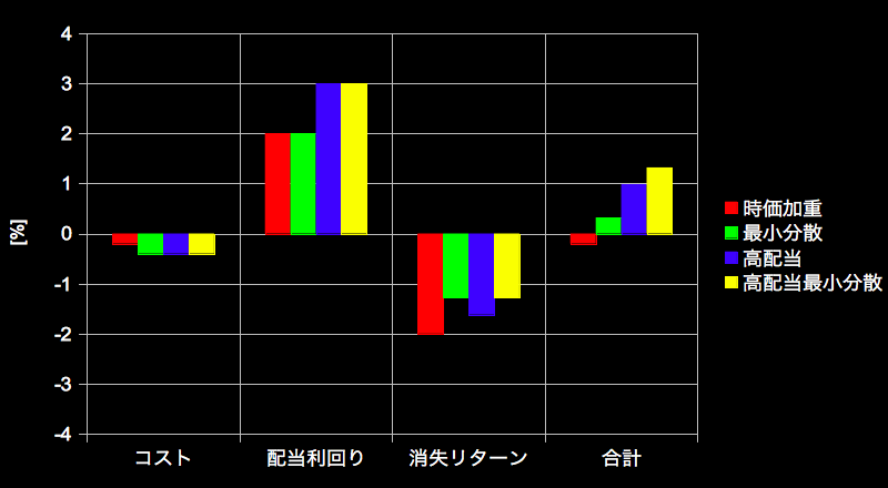 配当利回りやシグマの値は私が以前解析した結果にコンシステントでキリのいい数字を入れています。コストも増配インデックスとiシェアーズETFを参考に大きくは外していないと考えます。不確定要因があるとすれば非時価インデックスの間接コスト(売買、課税等による経費率の上乗せ)です。