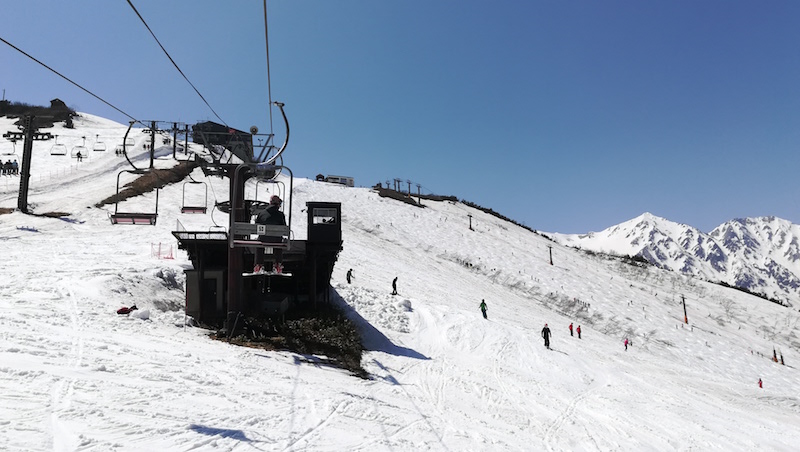長くて遅いペアリフトだとマジでヤバいですね。同じく八方尾根のスカイライン第2ペアリフトは約1000mの長さを10分くらいかけて登ります。右手に残雪の北アルプスを見ながら思わずウトウト。危うく落ちそうになるという恐ろしいリフトです(けっこう高いところを通るのでなおさら怖い)。