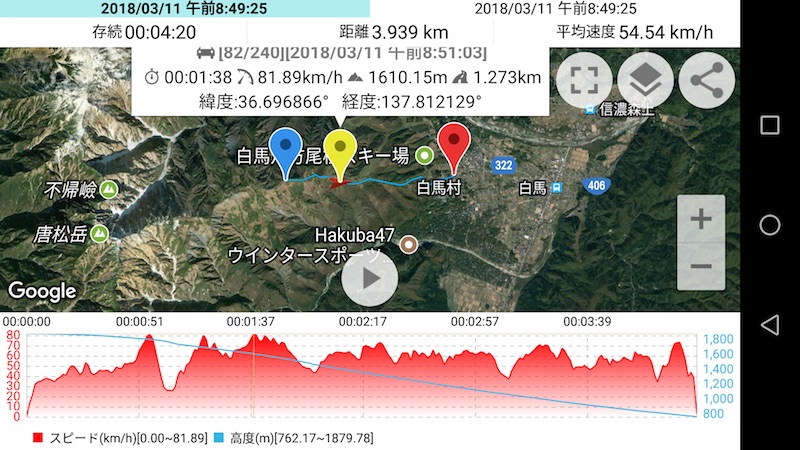 上図はGPSアプリによるトレースです。位置エネルギーが運動エネルギーに変換されることを実感する最高の贅沢だと思います。