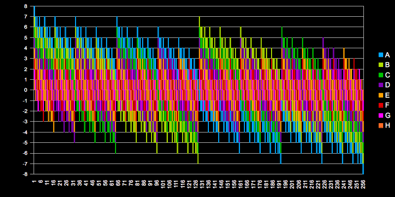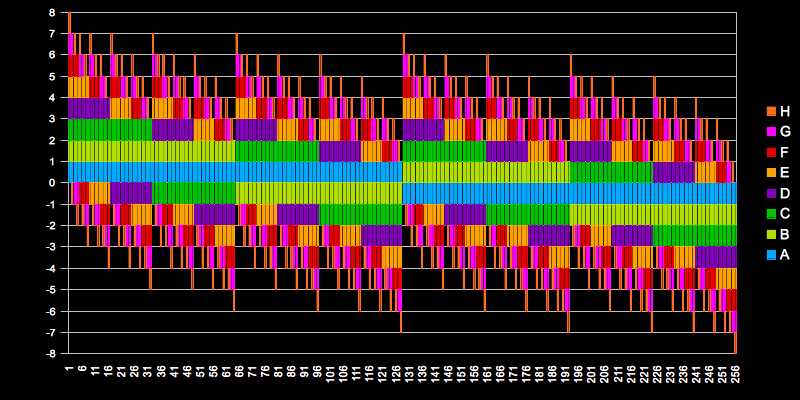 このとき取りうるすべての組み合わせを棒グラフ(短冊)で表したのが冒頭の図です。2倍を「1」、1/2倍を「-1」として積み上げプロットしています。スクリプトでfor文を回していますがおそらく以下のように並び替えた方がわかりやすいかと。