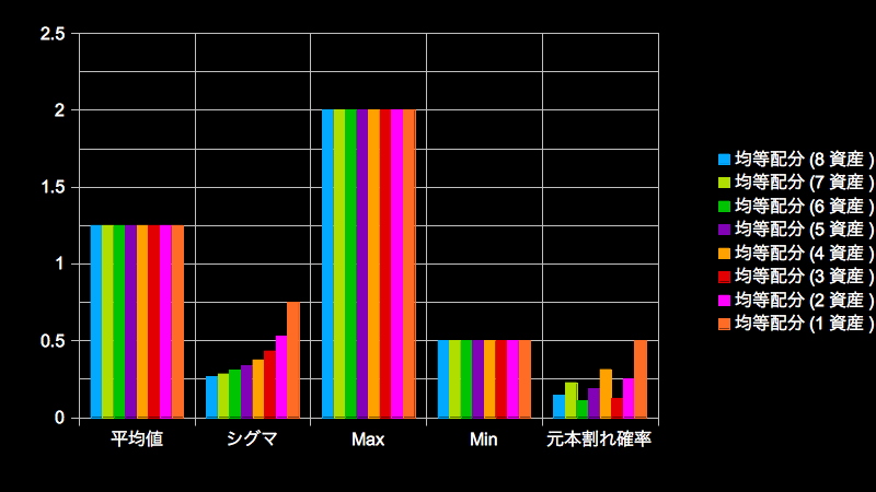 しかし元本割れ確率はnに対して単調減少になりませんでした。8資産均等型より6資産均等型や3資産均等型の方が小さい。どうもこれは元本割れの定義に「1」を含めるか否かに依存するようです。上記計算は「1」は元本割れに含めていません。含めると6/3資産均等型の元本割れ確率は悪化しました(それぞれ34%と50%になる)。これについては変化率のパターン(分解能)を増やせば単調減少する気がします。