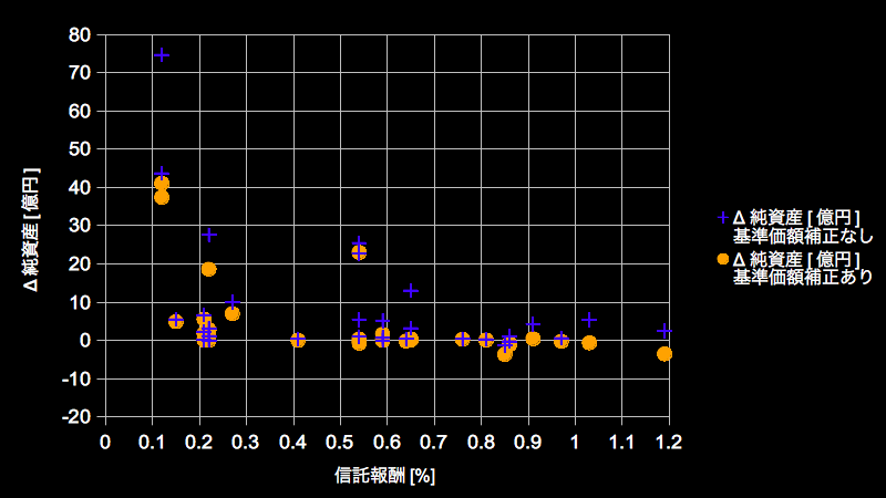 Δ純資産[億円]基準価額補正あり(t)=純資産(t+Δt)-純資産(t)×基準価額(t+Δt)/基準価額(t)