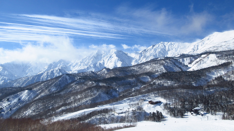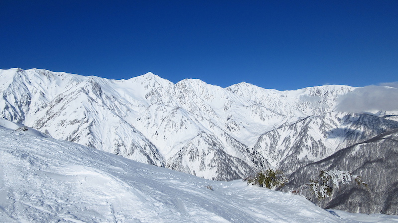 上の画像は北アルプス・白馬三山(しろうまさんざん)を栂池高原スキー場から見たものです。下の画像は同じ白馬三山を白馬八方尾根スキー場から見たものです。