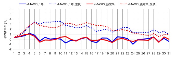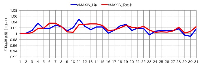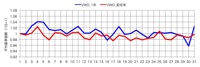 やはりというべきか、特にこの1年間は月末が有利な傾向があります。騰落率のSTAM/eMAXISとVWOとの差は為替でしょうか。だけどたぶん重要なのは実際の買付価格になる基準価額の方だと思います。