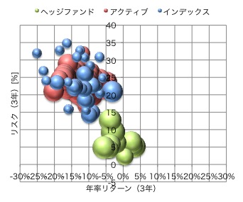横軸は3年間の年率リターン、縦軸はリスク(標準偏差)、バブルの大きさは信託報酬です(2011/10/03現在)。インデックスとアクティブは「国内大型ブレンド」の検索結果すべて、ヘッジファンドは日本株と確認できたものをピックアップしました。