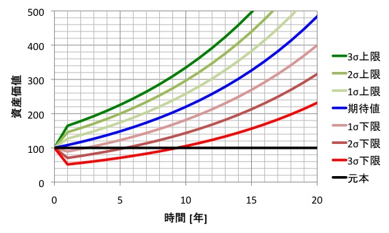 例えば、図1では5年後1σ(=68%)の確率で元本を最低20上回っているけど、運悪く3σ(=99.7%)の確率ではまだ30下回っているかもしれない、というものです。 しかし9年くらい我慢すると、3σでも元本を上回ることができます。