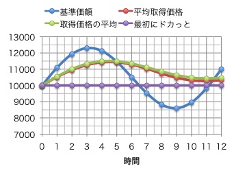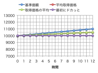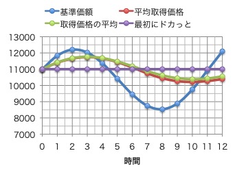 毎月一定金額買った場合。ドルコスト平均法を表す。