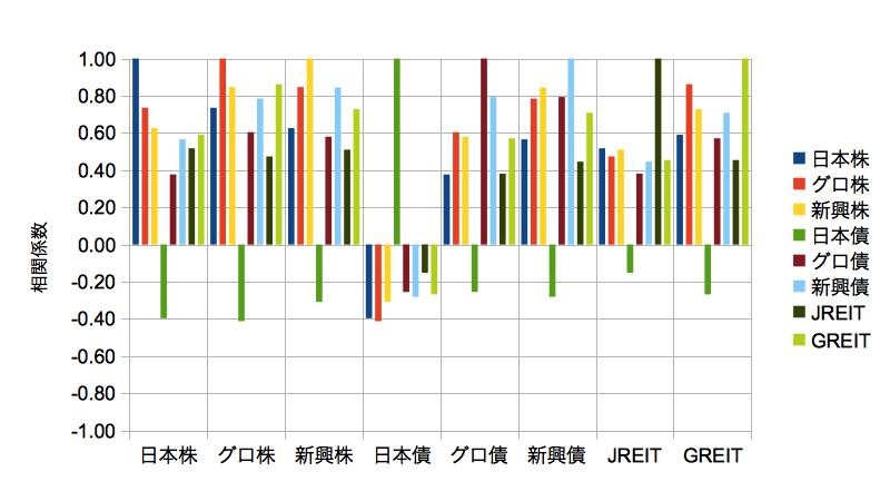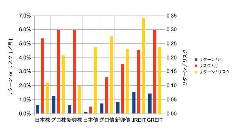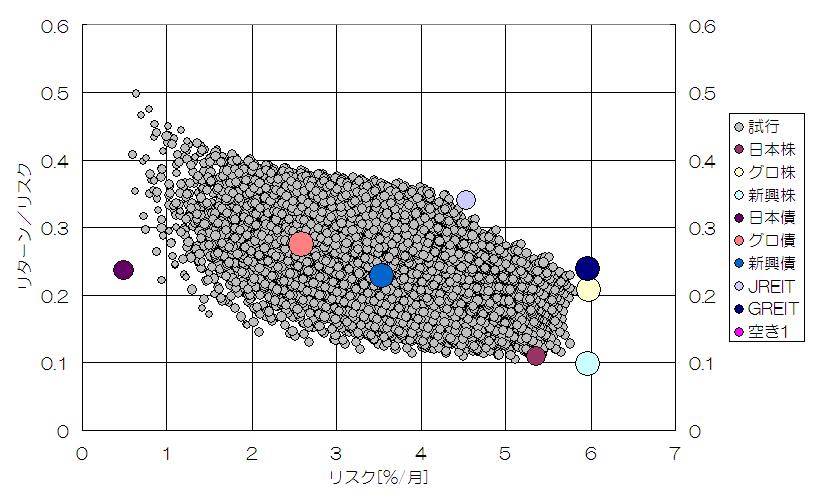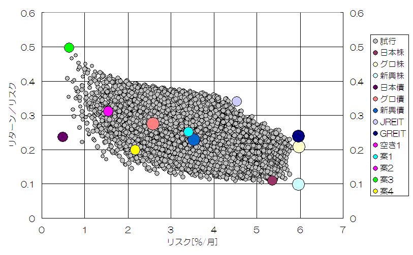 今回の日本債は単独ではリターン/リスクは高くないですがグロ債や成績のよいJREITが相関係数を絡めて少しブレンドされるだけでかなり向上します。