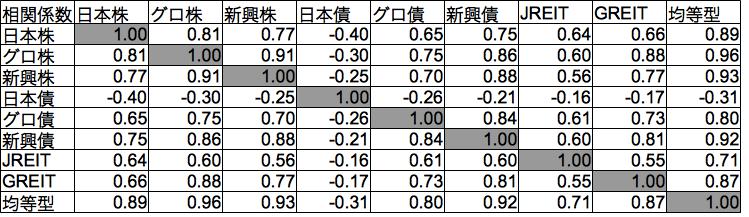 相関係数は共分散をそれぞれの標準偏差で割っているのでリスクをかけたもの同士で比較するとバランス型とだいたい一致します。