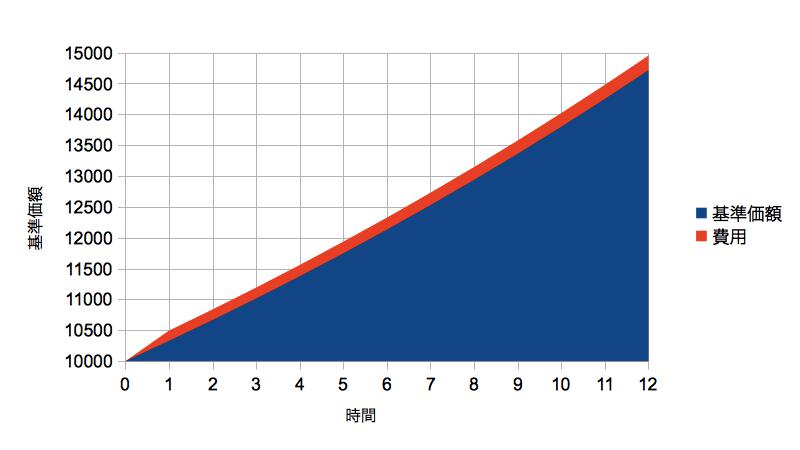 わかりにくいですが基準価額が上がるにしたがって費用(=信託報酬)も増えています(比率は同じ)。つまり基準価額が上がれば金融機関もおいしいということがわかります。