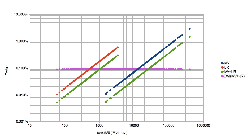 IVVとIJRの時価総額はlogで表示しないといけないくらい差がありますが、個別のファンドで構成されればその時価総額の差(比)は1:1にスケールされます。つまりIVVのいちばん大きな銘柄とIJRのいちばん大きな銘柄のウェイトはほぼ同等と考えてもよく(時価総額の2桁の差はなくなる)、これら個別のファンドを我々がブレンドして使えば時価総額加重をある程度均すことができるはずです。