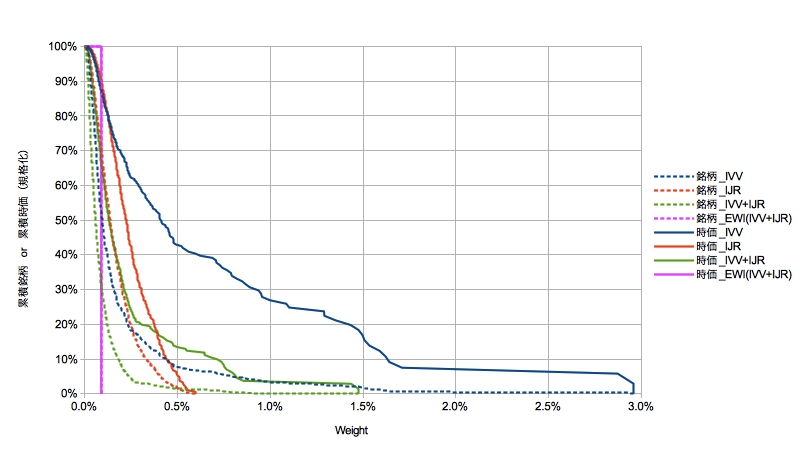例えば、横軸0.5%で見ると、IVVはウェイト0.5%以上の銘柄が数で8%しかないのに時価で43%を占めているという意味になります。また1つでもウェイトの大きな銘柄がいるとだらだらと裾を引き、IVVは最大3%の銘柄(Apple)が含まれます。対してIJRは最大でも0.6%であり、ヒストもより理想的な階段状に近くなっています。EWIは銘柄・時価ともに完全な階段分布で一致します。