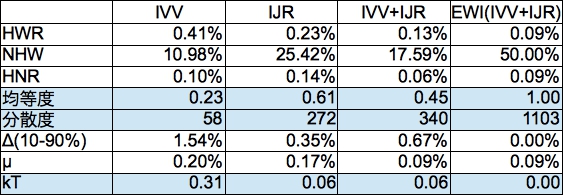 IVV+IJRの均等度をIVVより大きくすることができました。また分散度は銘柄数が増えていることもありIJRより大きくなっています。kTも0に近くなっています。