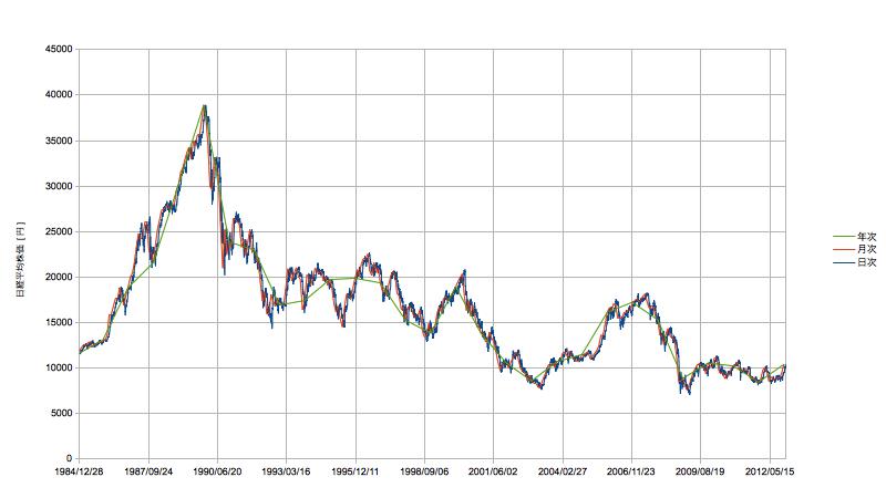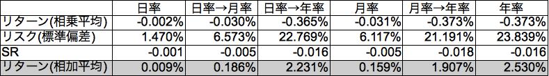日経平均を日、月、年単位で独立にリターン、リスクを出したものと、換算したものとを比較します。1年=12月=240日としています。1984年12月28日から2012年12月28日までです。