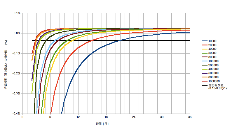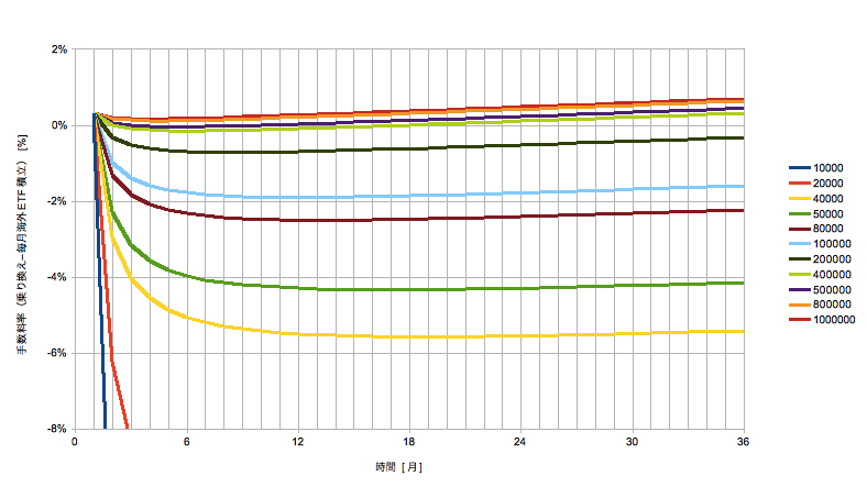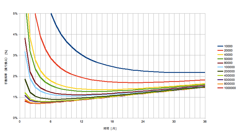 見方は、例えば50000(緑)の線で見ると、5万円を6ケ月積み立てて移した場合は1.6%くらいの手数料率になり、同じく12ヶ月積み立てて移した場合は1.3%くらいになります。(確認ですが手数料率には外国株式関連だけでなくeMAXISの信託報酬等も含まれています。)