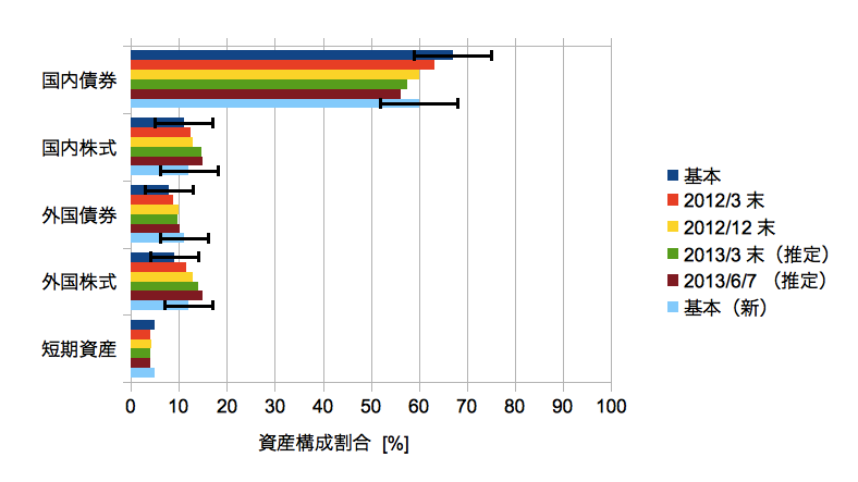 リスクの値が小さくなったので日本債以外の割合が増えたようです(リーマンとかを経ているのに小さくなったんですね)。基準はやはり「国内債券並みのリスク水準」のようです。つまりガス欠を補給するためではなく数字が変わったから変えただけということ?