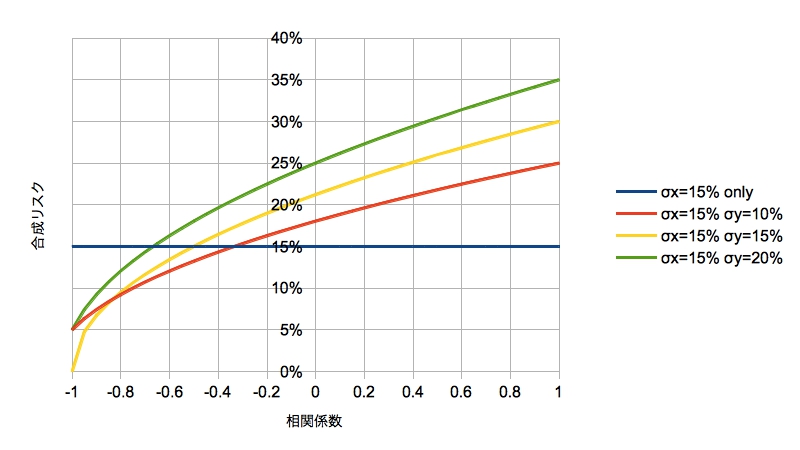 さらに、r=-1でリスクがゼロになっているのは15%と15%の組だけですが、これはリターンを1:1にしているためで、他の組もリターンがシグマの比になっていればキャンセルすることができます。例えば15%と10%ならμx:μy=15:10=3:2など。