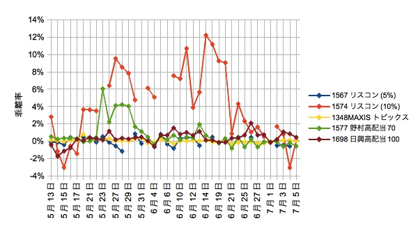 6/21にTOPIXが+0.7%に対してリスコン10%は-7.27%。一気に乖離率+0.87%まで縮まりました。戻ってくるならまだいいですが、10%前後の下方乖離が常態化しているETFもあり、不思議に思っています。