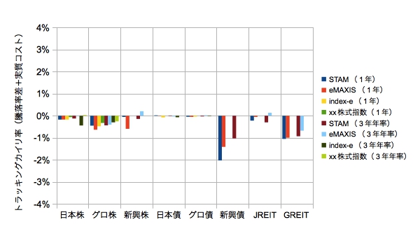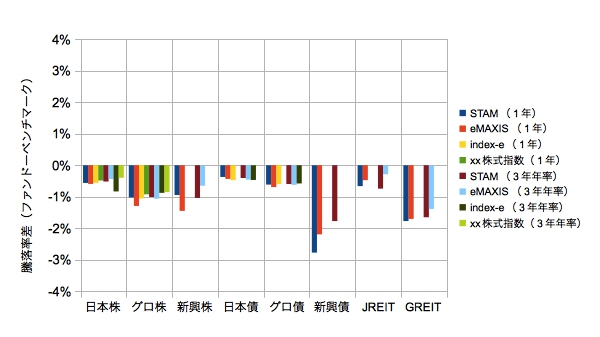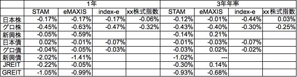 インデックスeとxx株式指数ファンドを追加しています。また3年を年率(複利)計算してから差分をとるように変更しています。さらに株式以外のベンチマークをSTAMに統一しました。