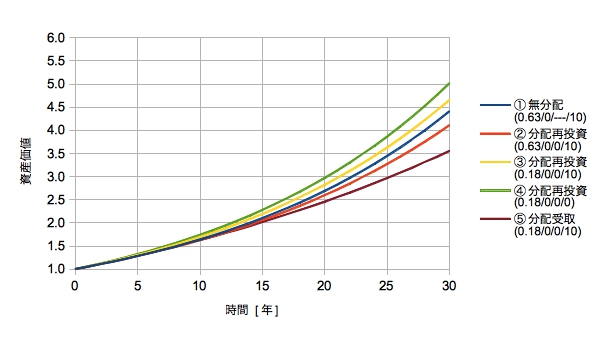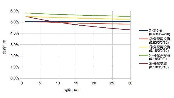 前回の結果(従来口座)と比べると非課税の恩恵は大きいです(期間30年≒恒久化は不明)。分配再投資は枠外再投資の課税が時間とともに支配的になり実質年率が低下していくようです。