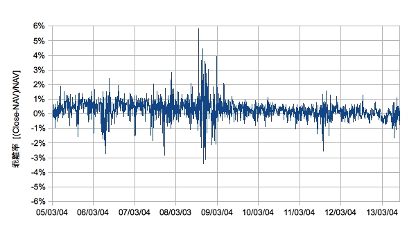 VWO設定日の2005/03/04(上場は2005/03/10らしい)から2013/08/09までの1日単位の乖離率です。