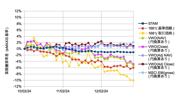 【累積騰落率差にVWOのNAV、Close、Adj NAVを追加】