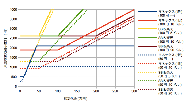図のように、マネックス(新)はケータイの二段階定額と同じ形で、為替には依存しますが株価には依存しません(スロープの位置は原点を通る傾き0.004725の直線で固定)。一方、SBI&楽天とマネックス(旧)は為替と株価で決まるある金額以上になると1株0.021or0.0105ドルに応じた傾きで増加します。その傾きは株価が同じなら為替に依存しませんが株価が低いほど急峻になります。