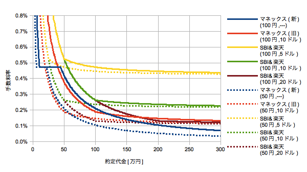 おもしろいのはマネックス(新)が定率領域を挟んで二段階反比例になることです。またSBI&楽天とマネックス(旧)も為替が同じなら株価が違っても同じ曲線上を反比例します。そして株価の低い順に1000株でドロップアウトし、そこから急激に傾きが緩やかになります。