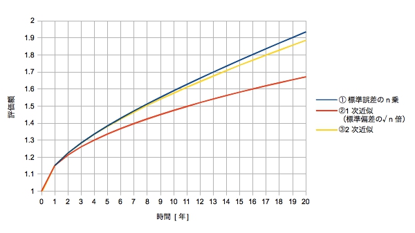 その場合年率リスクは一般的に15%程度で微小量とするには大きく、近似誤差(複利の効果)が無視できないと考えられます(そもそもσ√nの根拠である誤差伝搬法則も近似を使っている)。それを2次(③)まで展開するだけでかなり近づきます。