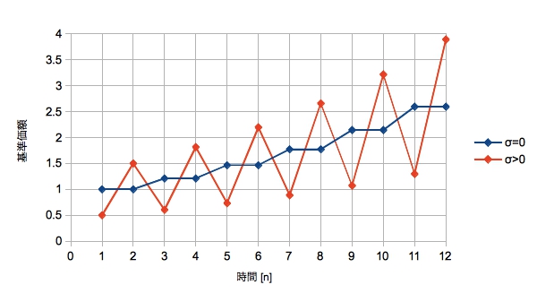 基準価額(初期値p)がリターンμで増えるラインを基準に-σ、+σをn/2回ずつ交互に繰り返すケースです。そのためμは"2回に1回の割合で2回分が掛かる"とします。またnは偶数とします。以下に例としてp=1、μ=10%、σ=50%、n=12の場合をプロットします。