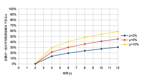投資は基本的にμ>0の右肩上がりを想定するので積立を続けるほど定額購入の方が平均取得価格が高くなります。「≧?」というわけのわからない符号をつけたのは、上記で算出した式からσによって平均取得価格を下げることができるからです。ではμとσがどのような関係ならば一括購入に勝てるのか。