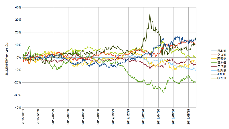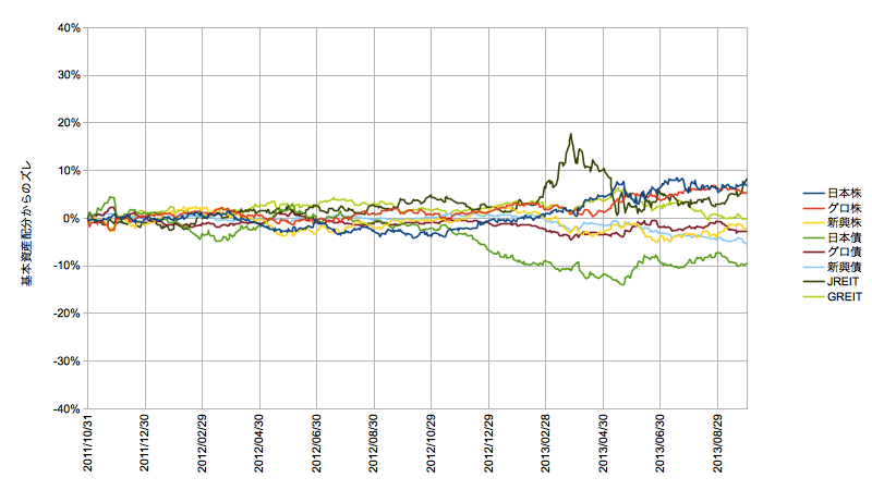 バラ売り対決で用いたeMAXISの時系列データを用います。毎月積立を続けながら、各資産の12.5%からのズレの推移を算出すると以下のようになります。②で各資産の時価を求める際は均等型の時価を8等分して加えています。