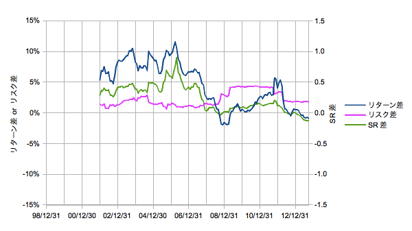 どのような見せ方がいいかいろいろ考えましたところ、やはり時系列変化がよいと判断しました。そこでまず、あるタップにおける移動相乗平均(リターン)の年率換算と移動標準偏差(リスク)の年率換算、およびそのシャープレシオの推移を時価総額、等配分でそれぞれ算出します。そして時価総額から見た等配分の差分の推移をプロットします。タップはあまり長すぎても表示できる期間が短くなってしまうので1年と3年とします。移動計算にしたのは、期間の取り方(始点、タップ)でいかようにもできるのでその偏りが無いようにするためです。