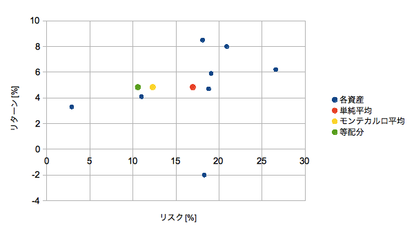 まず当時の8資産のリスクリターンを確認します。さらに、それらを単純平均したもの(相関係数=1)、6435通りのポートフォリオの平均(モンテカルロ平均)、等配分の3つを加えます。