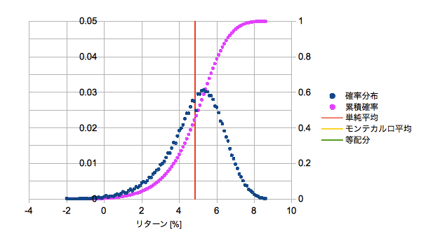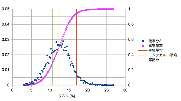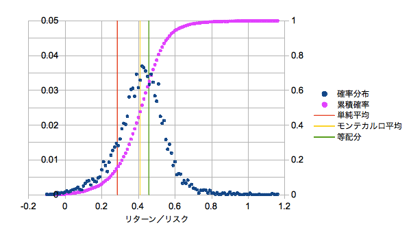 相関係数の効果によりモンテカルロ平均は単純平均よりリスクが小さくなります。等配分はさらに分布の端に寄っていることから、等配分のリスク低減効果がモンテカルロ平均より効率的であることがわかります。