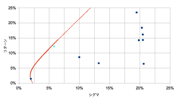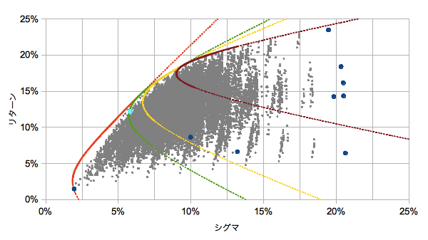 すべての点が曲線の内部に存在することが確認できます。ちなみにオレンジ付近の隙間は1/9単位の配分では分解能が足りていないためです(日本債がほとんどで他が数%の領域)。